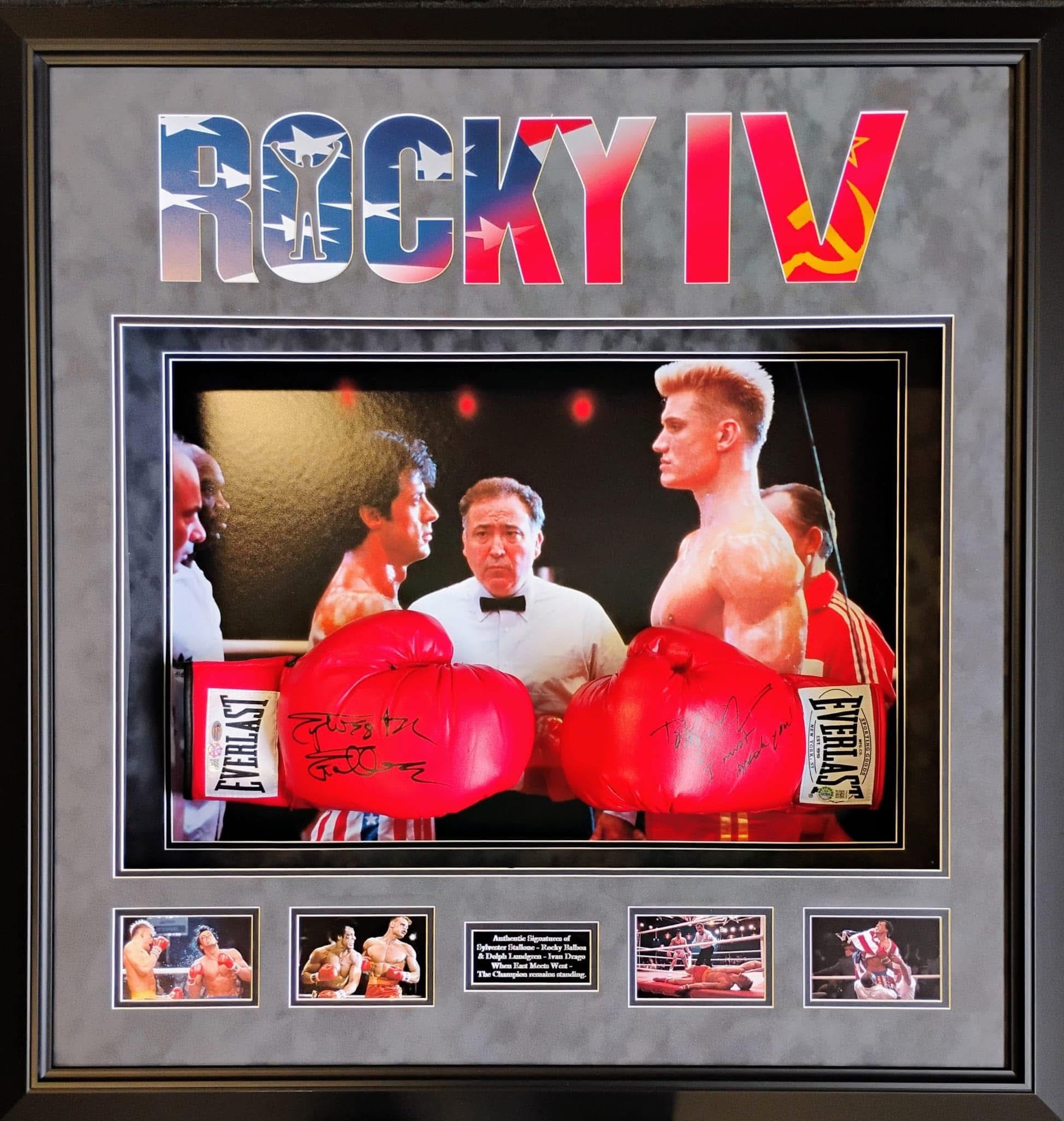 Signed gloves of Sylvester Stallone with online authentic's & AFTAL Authentication and Dolph Lundgren with AFTAL Authentication.